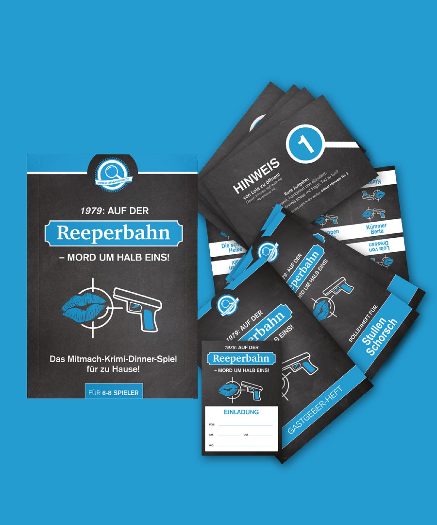 Spielt unser Mitmach-Krimi-Dinner mit Freunden – zu Hause, im Restaurant, in der Hütte oder beim Picknick. Einer von euch ist der Mörder! Findet gemeinsam heraus, wer. Ein unvergesslicher Abend voller Spannung und Rätsel erwartet euch.